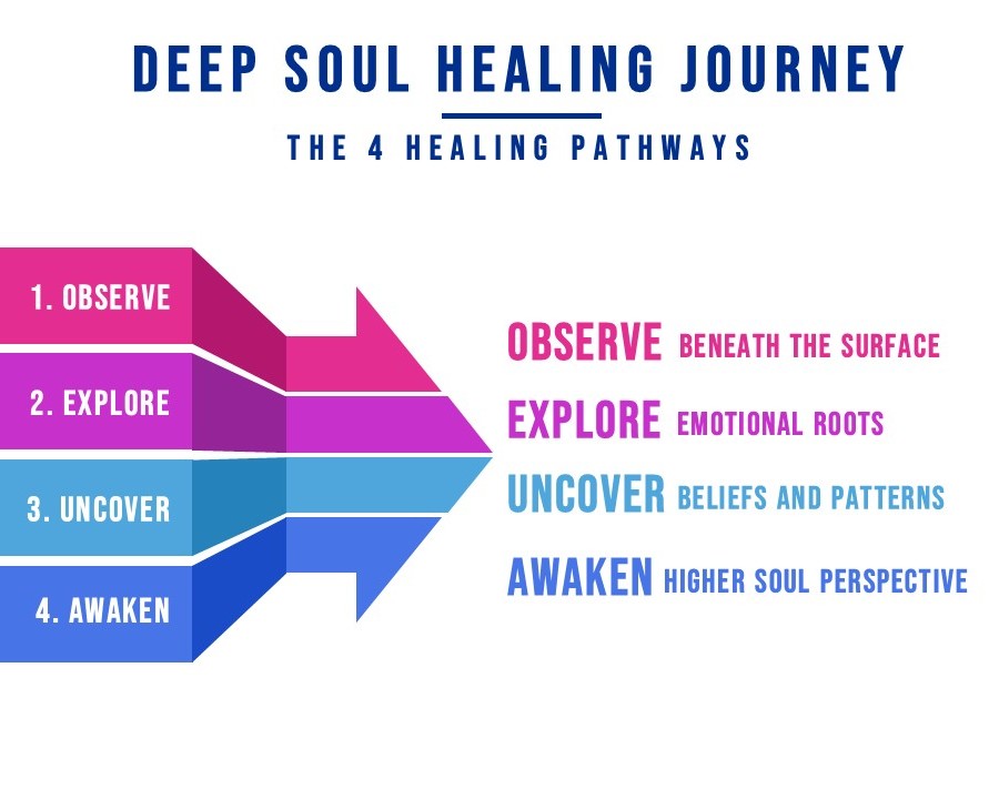 The Deep Soul Healing Journey unfolds through four interconnected pathways — each one a facet of your inner healing and awakening process.
